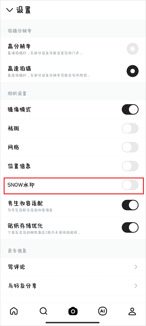 3、进入设置页面后,找到【SNOW水印】选项,将右侧开关关闭即可。