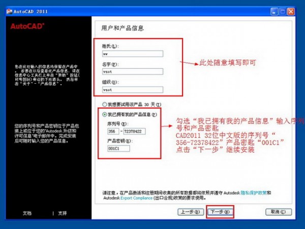 用户信息自己所以填写即可 勾选“我已拥有我的产品信息” 输入CAD2011 32位中文版的序列号“356-72378422”产品密匙“001C1” 点击“下一步”按钮继续安装 如图六。