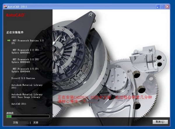 正在安装CAD2011 32位中文版 此过程会持续几分钟--请耐心等待一下...... 如图八。