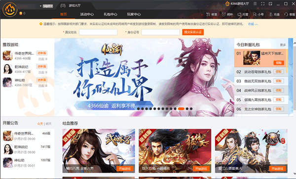 4366游戏大厅是4366网页游戏为游戏用户专门打造的一款游戏客户端,里面有大量的各种类型的4366网页游戏,用户可以在这里找到自己喜欢的游戏并且进入试玩。4366游戏大厅里面不仅仅拥有海量游戏,还包括各种活动,参加活动就可以领取礼包,玩家中心可以看到自己的成长等级并且拥有vip礼包和新手礼包,也可以进行积分抽奖兑换和充值。用户通过4366游戏大厅可以体验海量新款游戏,让你闲暇的时间变得有趣起来