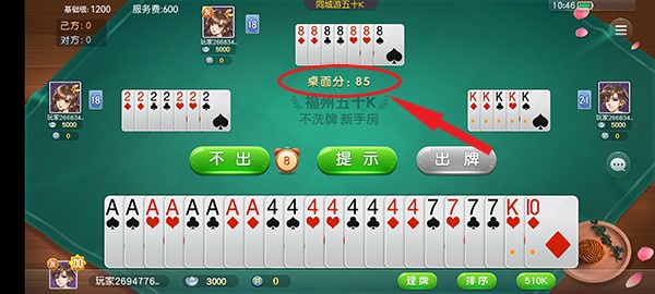4、抓分:5=5分,10、K=10分。玩家出牌,其他三家都选择不出,则获得桌面分。