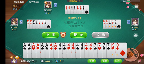 3、出牌:同城游锦州五十K游戏中,首局抓到红桃3先出牌,后续上局首游先出牌。