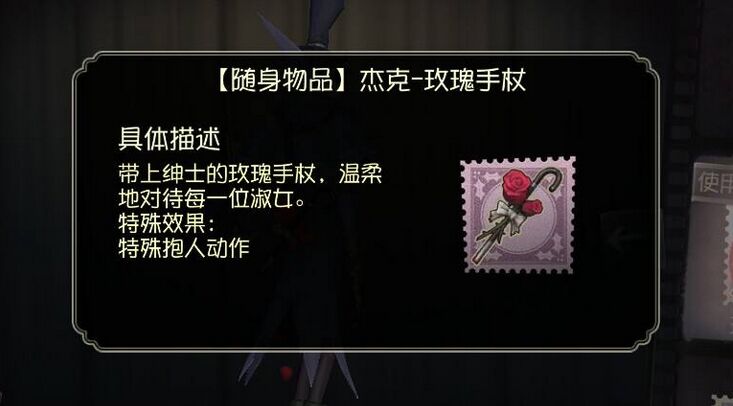 《第五人格》游戏里的玫瑰手杖是角色杰克的,玩家给杰克装备上玫瑰手杖后,可以获得公主抱的特殊效果。玫瑰手杖是在活动期间获得的,有完成推理任务和商城购买两种方式,目前已经下架。